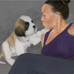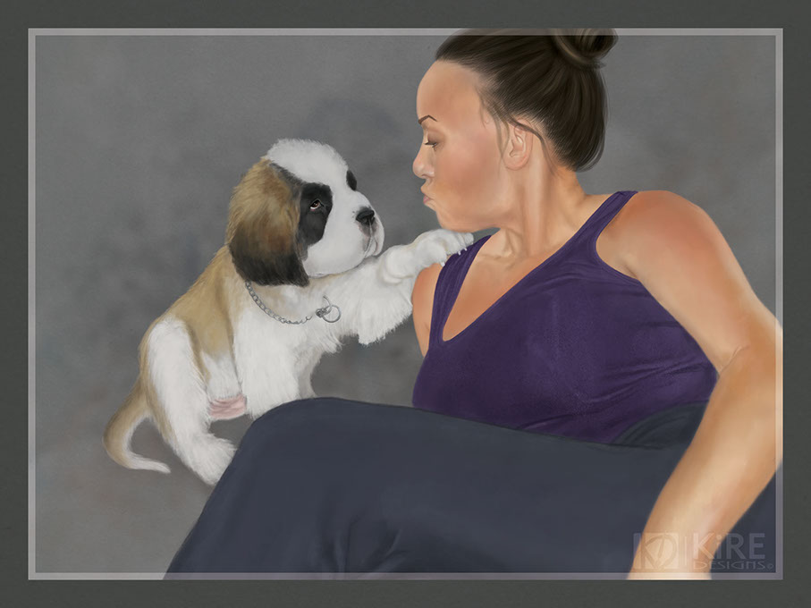 This painting is of a lovely lady and her St. Bernard pup. This was recreated using one of her favorite photos of them together as reference